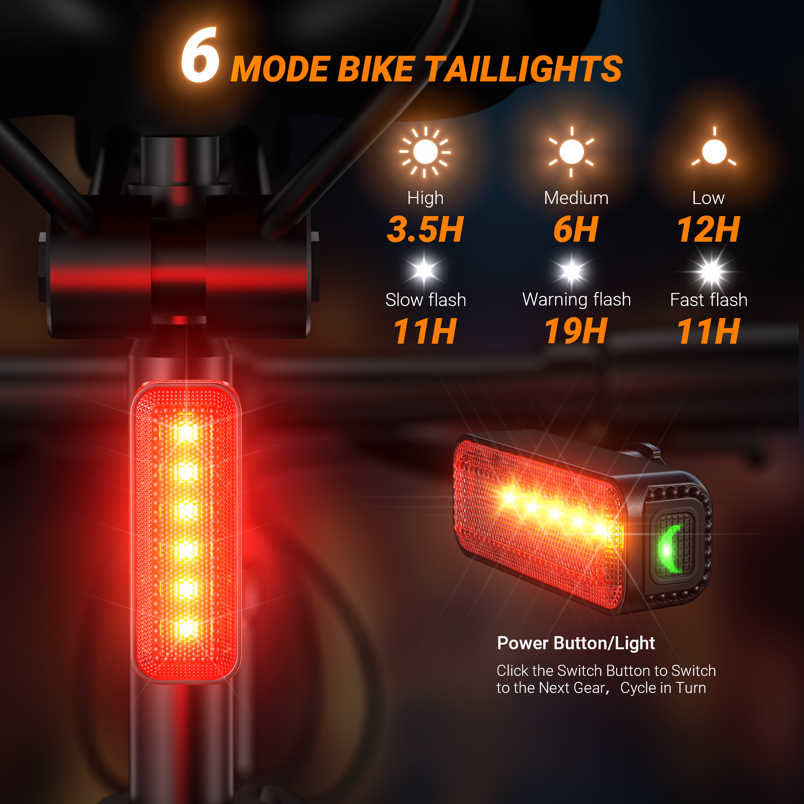 Mode(Runtime):High(3.5h)-Mid(6h)-Low(12h)-Slow flash(11h)-Warning flash(19h)-Fast flash(11h)
